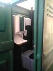 Туалетная кабина в "Люкс" комплектации.размеры 100100230 смобъём бака 250 лумывальник - стеклопластик, 30 л, зеркало, краник, раковинадозатор жидкого мыладиспенсер бумажных полотенецдиспенсер туалетной бумагиурна для бумаг вытяжная труба В комплект услуг входят :Доставка- Сервис Обслуживание- Возвра